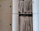 Штанги размещены на разных уровнях, что позволяет компактно хранить костюмы и другие предметы одежды разной длины. Такой подход экономит пространство, предотвращает смятие и обеспечивает наглядность и быстрый доступ.