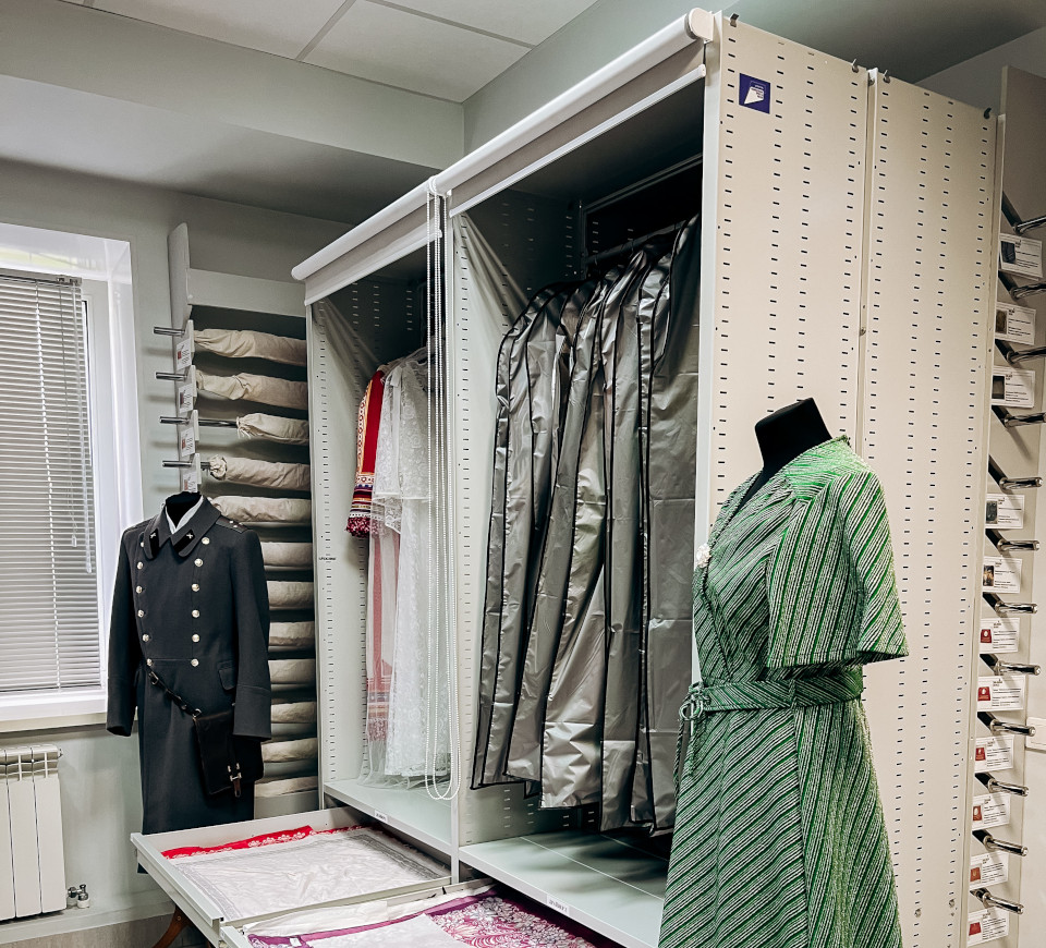 Изготовим передвижные стеллажи для хранения одежды на складе или в фондах музея с доставкой с завода производителя в города Костромской области и России.